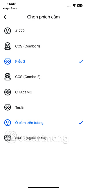 Hiển thị danh sách các loại phích cắm để bạn lựa chọn. Chúng ta nhấn vào loại phích cắm mà mình muốn tìm kiếm trạm sạc. Có thể chọn nhiều loại phích cắm cùng lúc để tìm kiếm trạm sạc trên Google Maps.
