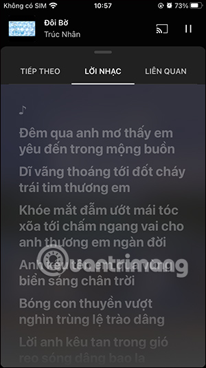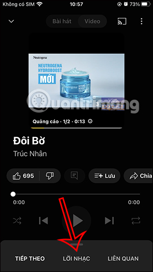 Trong giao diện phát nhạc trên YouTube Music, bạn nhìn xuống dưới màn hình rồi nhấn vào mục Lời nhạc. Ngay sau đó hiển thị lời nhạc bài hát trên ứng dụng YouTube Music để chúng ta theo dõi và hát theo.