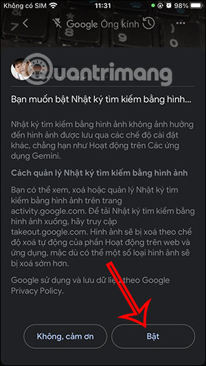 Khi đó bạn sẽ thấy thông tin về trình lịch sử Google Lens. Lúc này bạn cần bật chế độ lịch sử trên Google Lens. Như vậy tất cả các hoạt động trên Google Lens đều được lưu lại trong lịch sử.