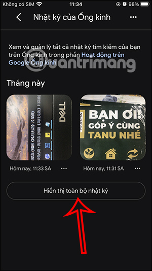Trong giao diện lịch sử Google Lens chúng ta nhấn chọn vào Hiển thị toàn bộ nhật ký. Hiển thị giao diện quản lý Google Lens, bạn nhấn vào Xóa bên dưới.