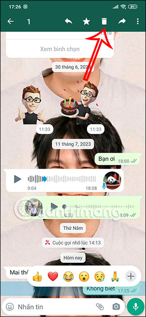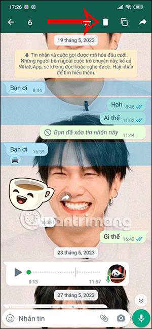 Tiếp đến trong giao diện hội thoại bạn nhấn và giữ vào tin nhắn mà chúng ta muốn xóa. Lúc này hiển thị các tùy chọn cho tin nhắn trên WhatsApp, chúng ta nhấn vào biểu tượng thùng rác để chọn xóa tin nhắn này.