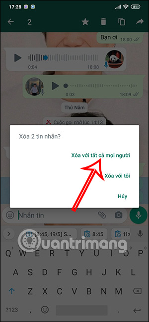 Khi đó WhatsApp hỏi bạn muốn xóa tin nhắn này cho bạn hay cho tất cả đối phương tham gia tin nhắn. Để xóa tin nhắn cho cả 2 bên thì chúng ta nhấn vào Xóa với tất cả mọi người.