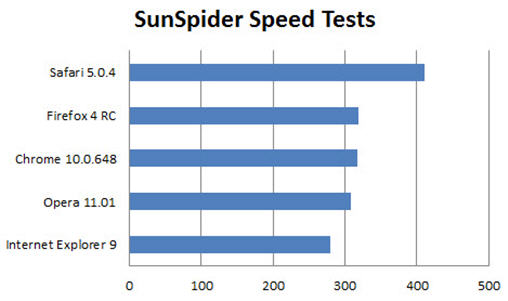 IE 9 mất trung bình 280 mili giây (ms) để hoàn thành các bài kiểm tra, tiếp theo là Opera 11.01 tại 308,8 ms, Chrome 10.0.648 tại 316,7 ms, Firefox 4 Release Candidate tại 319,1 ms và Safari 5.0.4 tại 410,2 ms.
