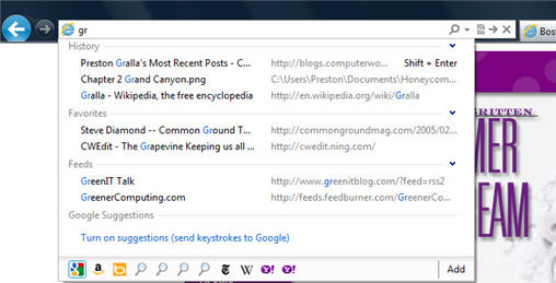 Với IE9, thanh địa chỉ bây giờ thực hiện nhiệm vụ kép: vừa là một thanh địa chỉ vừa là một box tìm kiếm. (Để làm nổi bật khả năng này, Microsoft đề cập đến nó với cái tên “One Box”.) Khi bạn gõ nội dung tìm kiếm của bạn, trình duyệt của bạn nhìn vào History, Favorites và Feeds, và hiển thị phù hợp. Bằng cách đó, bạn có thể nhanh chóng tìm thấy một trang web hoặc thực hiện tìm kiếm bằng cách chọn một sự lựa chọn và nhấn Enter. Tất nhiên, bạn cũng vẫn có thể gõ toàn bộ từ khóa tìm kiếm của bạn và nhấn Enter để tìm kiếm trên web bằng cách sử dụng công cụ tìm kiếm mặc định của bạn.