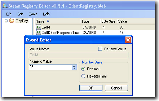 Vậy, chúng ta phải làm gì? Tải ClientRegistry Toolkit, mở file ClientRegistry.blob, trong cửa sổ bên phải, tìm kiếm CellId, kích đúp lên file đó và đổi giá trị – tương ứng mã vùng mà Steam dùng sử dụng để kết nối: