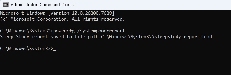 powercfg /systempowerreportLệnh này sẽ tạo ra một báo cáo về nguồn điện, bạn có thể tìm thấy báo cáo tại vị trí này: “C:\Windows\System32\sleepstudy-report.html”. Sao chép/dán đường dẫn này vào thanh địa chỉ của File Explorer để mở trong trình duyệt của bạn.