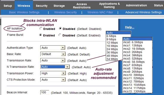 - Điều chỉnh tốc độ tự động thường là tốt nhất, tuy nhiên các kết nối yếu đôi khi có thể được cải thiện bằng cách giảm tốc độ lớn nhất của router. Ngược lại, thông lượng kết nối mạnh thường được cải thiện bằng cách vô hiệu hóa các tốc độ chậm hơn. Tuy nhiên cần lưu ý một điều rằng: Việc loại trừ các tốc độ thấp có thể hủy kết nối các máy khách ở xa hoặc cũ, trong khi đó việc loại trừ tốc độ cao lại đòi hỏi phải có khoảng cách đến các khách gần hơn hoặc có các máy khách mới hơn.