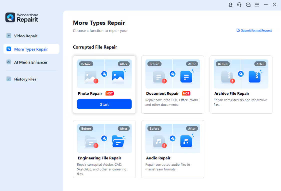 Khởi chạy Wondershare Repairit trên máy tính Windows và vào tính năng More Types Repair từ thanh bên, sau đó chọn Photo Repair.