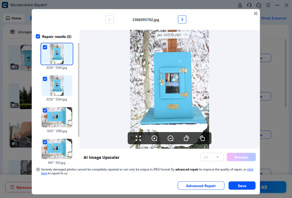 Nhấp vào nút Repair và chờ ứng dụng triển khai thuật toán độc đáo để sửa ảnh đã load. Khi quá trình sửa chữa hoàn tất, ứng dụng sẽ thông báo cho bạn về kết quả.