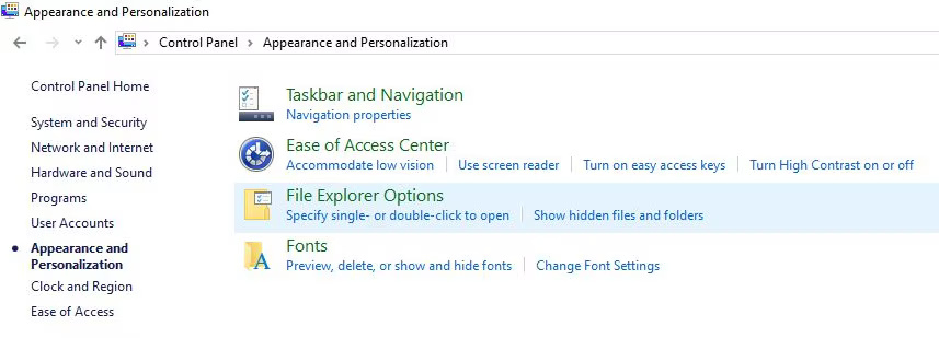 1. Trước tiên, hãy vào Control Panel, sau đó nhấp vào giao diện và chọn Appearance and Personalization. Bây giờ, hãy nhấp vào tùy chọn File Explorer.