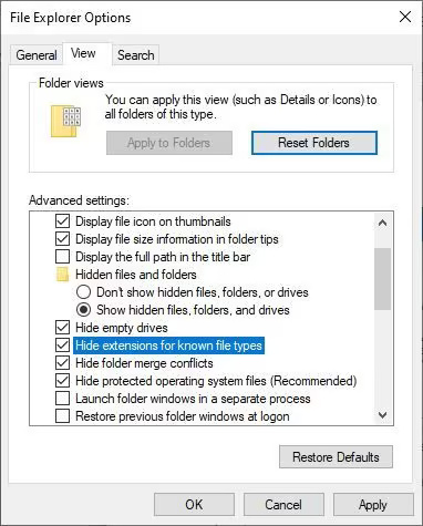 2. Bây giờ, hãy chuyển đến tab có nhãn View và chọn tùy chọn hiển thị phần mở rộng ẩn. Ngoài ra, hãy bỏ chọn tùy chọn ẩn phần mở rộng cho các loại file đã biết. Bây giờ, hãy nhấp vào tùy chọn Apply và bây giờ, bạn có thể sử dụng file.