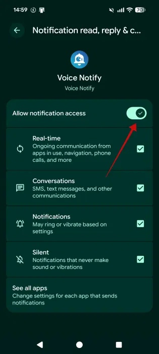 Sau khi cài đặt ứng dụng, hãy mở ứng dụng và nhấn vào tùy chọn đầu tiên trên màn hình chính để bật dịch vụ Voice Notify. Bạn cần cấp quyền cho ứng dụng truy cập vào thông báo trên Android của mình, sau đó bạn có thể bật và tắt Voice Notify tùy ý từ ứng dụng. Bất cứ khi nào cảm thấy không cần thông báo bằng giọng nói, bạn có thể nhanh chóng tắt chúng đi.