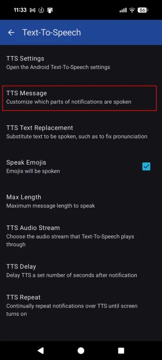 Đối với các thông báo Gmail, Voice Notify không đọc nội dung email theo mặc định, ngay cả khi nó hiển thị trong bản xem trước thông báo. Để khắc phục điều này, bạn cần vào Text-to-Speech từ giao diện chính của ứng dụng. Chọn TTS Message.