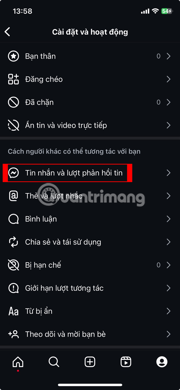 Instagram cung cấp cho bạn quyền quyết định ai có thể gửi cho bạn yêu cầu tin nhắn và nơi những yêu cầu đó được gửi đến. Bạn có thể quản lý việc này bằng cách nhấn vào vòng tròn nhỏ có ảnh đại diện ở góc dưới bên phải của ứng dụng để đi đến profile của bạn. Nhấn vào nút menu ở góc trên bên phải (3 gạch ngang xếp chồng lên nhau - hay còn gọi là "menu hamburger"). Từ đó, nhấn vào Tin nhắn và lượt phản hồi tin trong phần Cách người khác có thể tương tác với bạn.