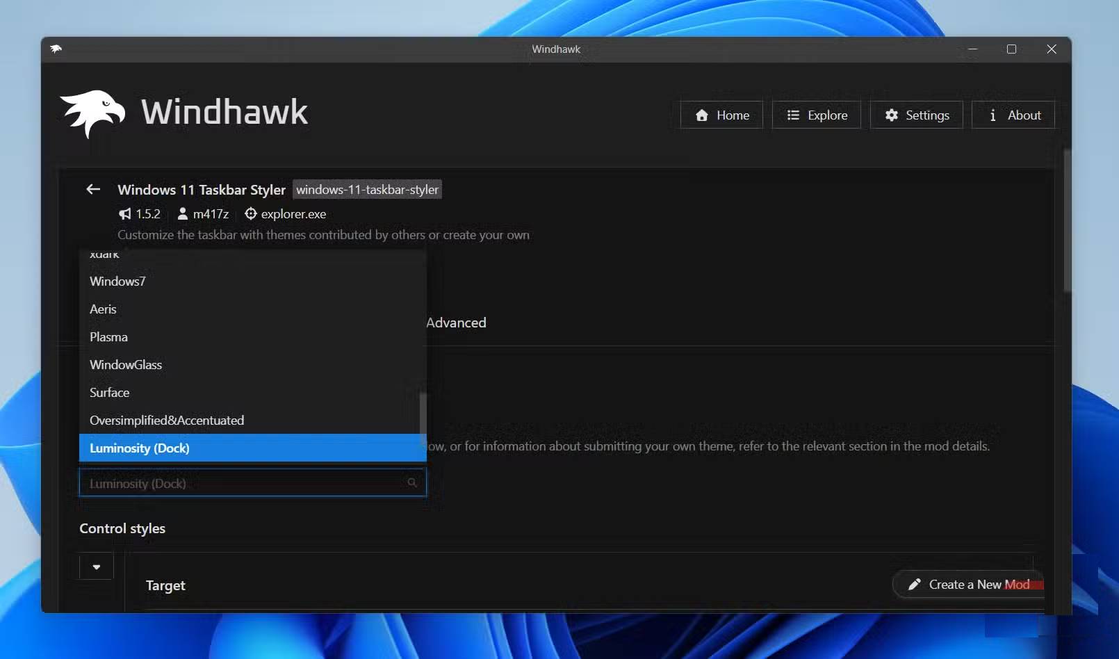 Windhawk cung cấp rất nhiều mô-đun cho phép bạn thay đổi giao diện của Taskbar. Nhưng nếu muốn tập trung hoàn toàn vào tính thẩm mỹ, bạn chỉ cần cài đặt Windows 11 Taskbar Styler. Mô-đun này cung cấp rất nhiều tùy chọn theme, từ các thiết kế tối giản, gọn gàng đến những thiết kế hoài cổ hơn, mô phỏng giao diện của Windows 7 hoặc Vista.