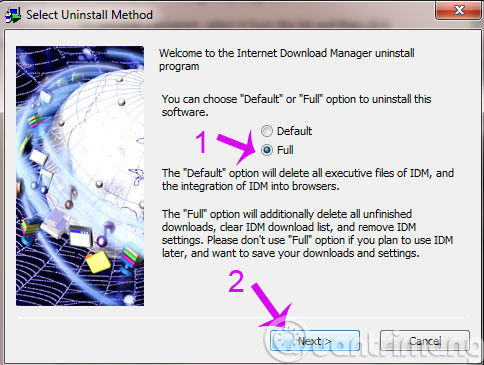 Ngay sau đó cửa sổ Select Uninstall Method xuất hiện cho phép bạn lựa chọn phương thức gỡ bỏ cài đặt IDM, hãy nhấn vào ô Full, rồi nhấn Next để chuyển sang bước tiếp theo.