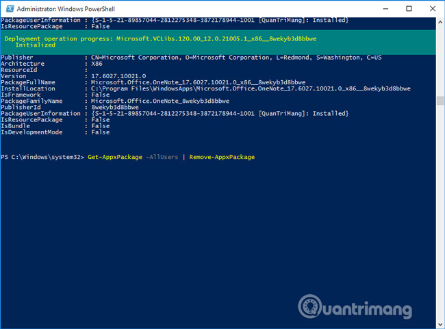Sau khi Enter thì màn hình PowerShell sẽ trông giống hình trên. Và để gỡ các chương trình đã có sẵn trong Windows 10, các bạn lần lượt thực hiện theo như bên dưới:
