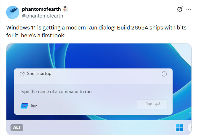 Blogger công nghệ @phantomofearth đã chia sẻ hình ảnh ban đầu về giao diện Run mới. Dù vẫn đang trong giai đoạn thử nghiệm, bức ảnh chụp màn hình cho thấy khá rõ hướng đi mà Microsoft muốn triển khai trong các bản cập nhật tương lai.