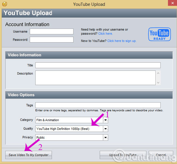 Bước 2: Khi hộp thoại YouTube Upload mở ra, bạn kéo xuống mục Video Options rồi chọn YouTube High Definition 1080p (Best) trong ô Quality. Sau đó bấm Save Video To My Computer