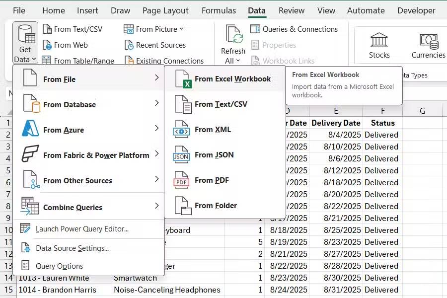 Giả sử bạn đã lưu trang tính này ở đâu đó trên máy tính. Để nhập, hãy chọn tab Data và nhấp vào Get Data -> From File -> From Excel Workbook trong nhóm lệnh Get & Transform Data trên ribbon.