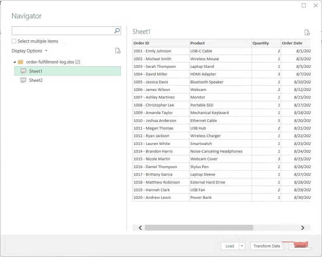 Từ đó, điều hướng đến vị trí file, chọn file và nhấp vào Import. Trong Display Options ở bên trái, chọn trang tính có dữ liệu và nhấp vào Transform Data. Lưu ý rằng đây chỉ là một cách để nhập dữ liệu vào trình soạn thảo - các tùy chọn sẽ khác nhau tùy thuộc vào nơi bạn lấy dữ liệu.