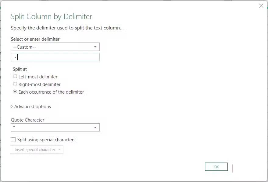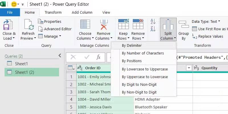 Chúng ta sẽ tách cột này trong Power Query bằng dấu phân cách, một ký tự hoặc biểu tượng (như dấu phẩy, dấu cách hoặc dấu gạch nối) để phân tách dữ liệu trong một ô. Dấu phân cách là dấu gạch nối hoặc dấu gạch ngang (-) phân tách ID đơn hàng khỏi tên khách hàng trong ví dụ trên.