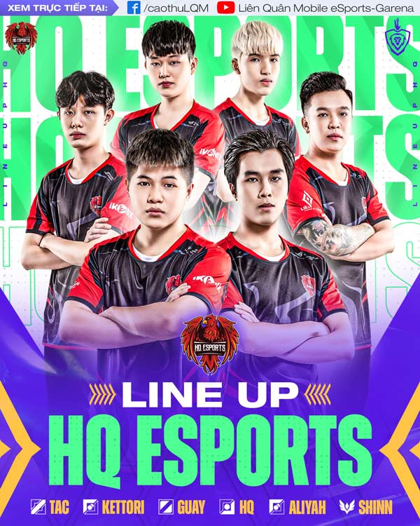 HQ Esports đã chiêu mộ được thêm Kettori ở vị trí đường Tà thần và tân binh mới Aliyah để sẵn sàng nhập cuộc giải đấu lần này. Danh sách cụ thể của HQ Esports tại giải đấu này như sau: