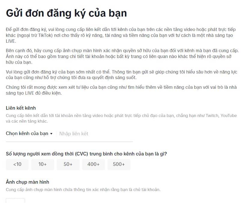 Lúc này bạn sẽ thấy đơn để đăng ký để nhập nội dung yêu cầu, chúng ta cần chờ TikTok duyệt đơn đăng ký của bạn mới sử dụng tiếp được tính năng livestream.