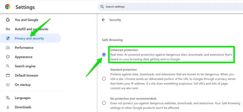 Tại đây, di chuyển đến Privacy and security → Security và chọn Enhanced protection trong phần Safe Browsing.