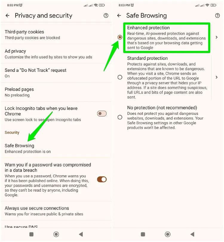 Trên thiết bị Android hoặc iOS, hãy mở Settings từ menu chính của Chrome, đi tới Privacy and security → Safe browsing và chọn Enhanced protection.