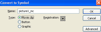 Trở lại layer picture 1 và nhấn phím F8 (Convert to Symbol) để chuyển đổi bức ảnh đầu tiên sang dạng Move Clip Symbol. Xem hình dưới.