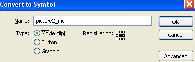 Dùng công cụ Selection Tool (V) và chọn layer picture 2. Sau đó nhấn phím F8 (Convert to Symbol) để chuyển đổi picture 2 sang dạng Movie Clip Symbol.