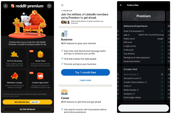 Một ví dụ là đăng ký cao cấp của Reddit, cung cấp cho bạn trải nghiệm không có quảng cáo, quyền truy cập vào subreddit độc quyền, huy hiệu profile, v.v... Một ví dụ khác là LinkedIn Premium. Đăng ký cao cấp này cung cấp quyền truy cập vào các khóa học LinkedIn, hiểu rõ hơn về những người đang xem profile của bạn, khả năng gửi InMail cho các nhà tuyển dụng, v.v...