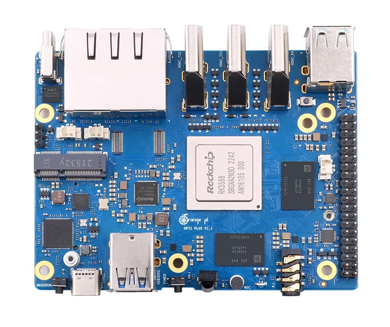 Orange Pi 5 Plus là một máy tính đơn bo ấn tượng dựa trên hệ thống trên chip RK3588 64-bit, lõi 8 mạnh mẽ. Nó có GPU ARM Mali-G610 mạnh mẽ và NPU nhúng, giúp nó phù hợp với các ứng dụng AI. Đây là bản nâng cấp của Orange Pi 5 và đi kèm với hỗ trợ ngoại vi tốt hơn cũng như header mở rộng 40 chân.