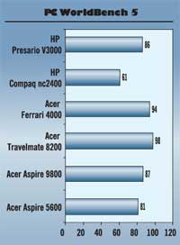 Máy có cấu hình khá mạnh và chạy BXL di động của AMD: Turion 64 ML-40 2,2GHz, và RAM DDR 1GB, đồ họa ATI Mobility X700 và ổ cứng 120GB (5400rpm). Máy đứng vị trí thứ 2 trong tháng này với 94 điểm WorldBench, chỉ sau Travelmate 8204WMLi. Ân tượng nhất là trong thử nghiệm về Microsoft Office, máy vượt lên dẫn đầu. Còn trong các thử nghiệm về pin với Mobilemark 2005, máy chỉ đạt trung bình: xem DVD gần 2 giờ, đọc văn bản được 3 giờ, chạy hỗn hợp và kết nối không dây khoảng 2 giờ 40 phút.