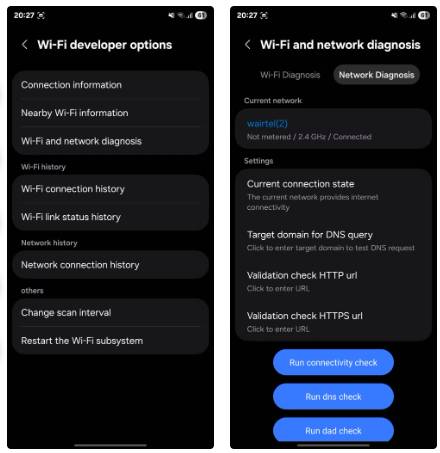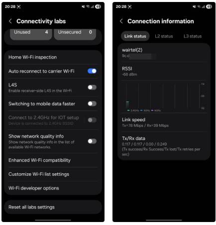 Menu các tùy chọn Wi-Fi cho nhà phát triển cung cấp cho bạn quyền truy cập vào một loạt các công cụ Wi-Fi bổ sung bên trong Connectivity Labs. Ví dụ, có mục Connection information, hiển thị cho bạn rất nhiều số liệu thống kê (cường độ, tốc độ liên kết, thế hệ, tần số, v.v...) cho mạng đang hoạt động của bạn.