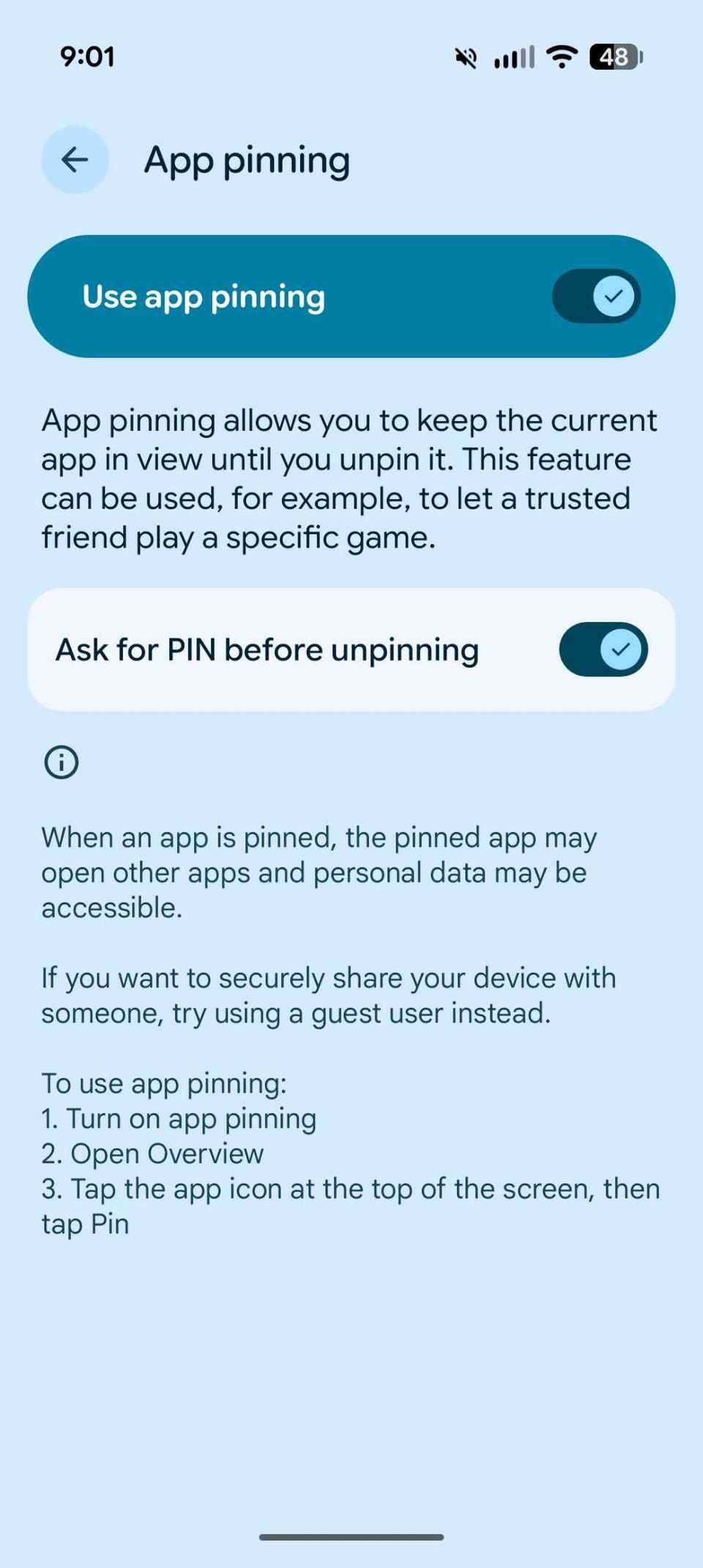 Để bật tính năng này, chỉ cần vào Settings -> Security -> Advanced / More -> App Pinning. Tất nhiên, cách nhanh nhất là tìm kiếm App Pinning trong Settings. Sau đó chỉ cần bật nó lên. Sau khi bật, bạn sẽ có các tùy chọn về việc mình có muốn xác thực để tắt ghim hay không (hãy bật tùy chọn này!) là xong. Ghim một ứng dụng dễ dàng như việc mở ứng dụng bạn muốn ghim, sau đó vào chế độ xem ứng dụng gần đây, nhấn vào biểu tượng chương trình và nhấp vào Pin.