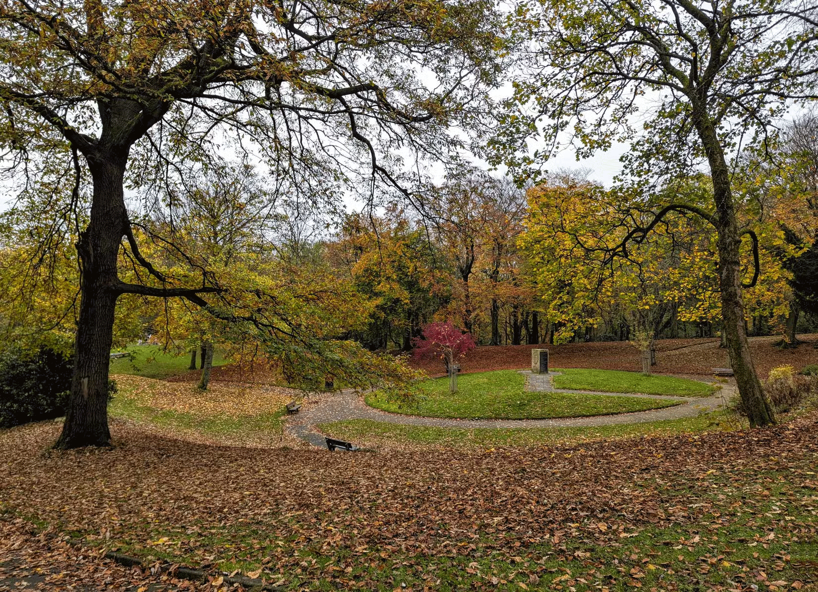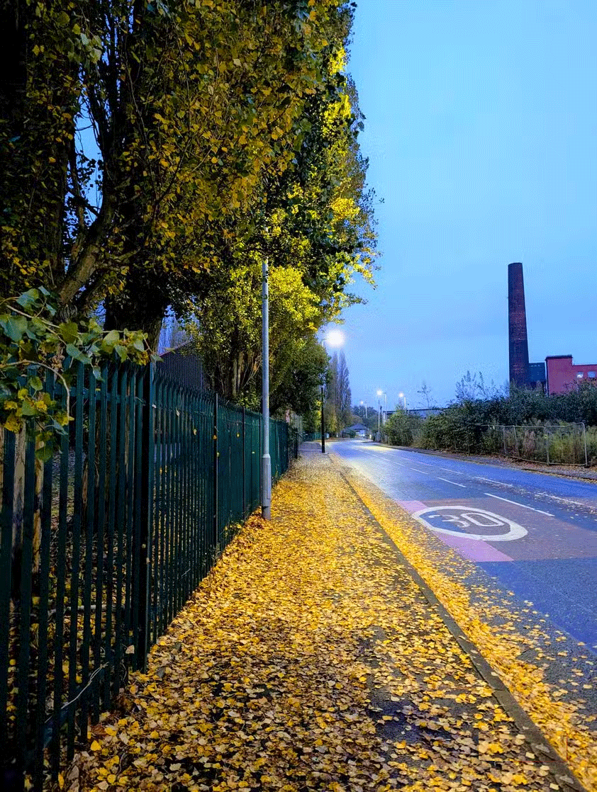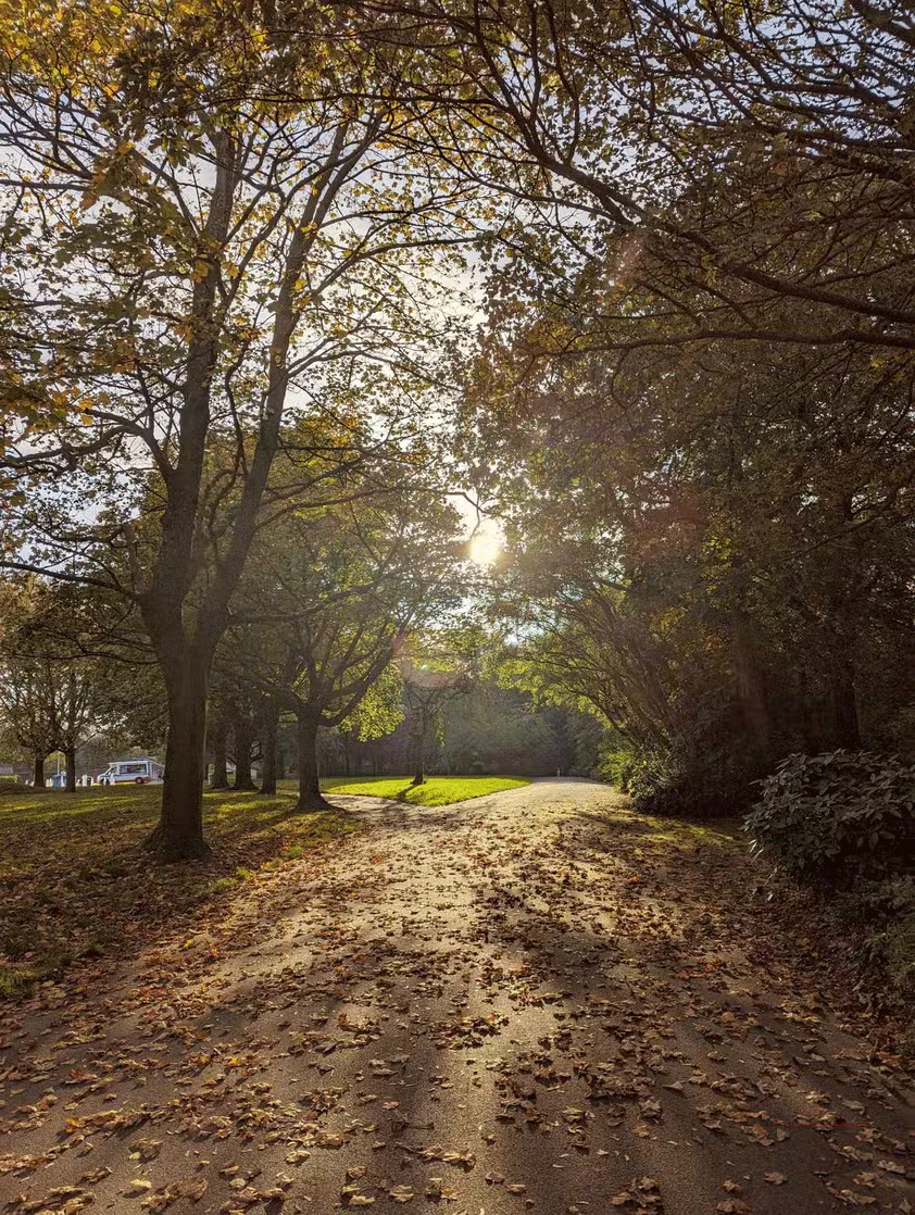 Bức ảnh đầu tiên ở trên, với ánh nắng mặt trời chiếu qua những tán cây, được chụp vào lúc bình minh. Công viên vắng tanh, và quang cảnh có một nét thanh thoát mà nó không thể có vào giữa ban ngày. Bức thứ hai được chụp vào lúc chạng vạng, ngay khi đèn đường bật sáng, làm sáng bừng những chiếc lá rụng.