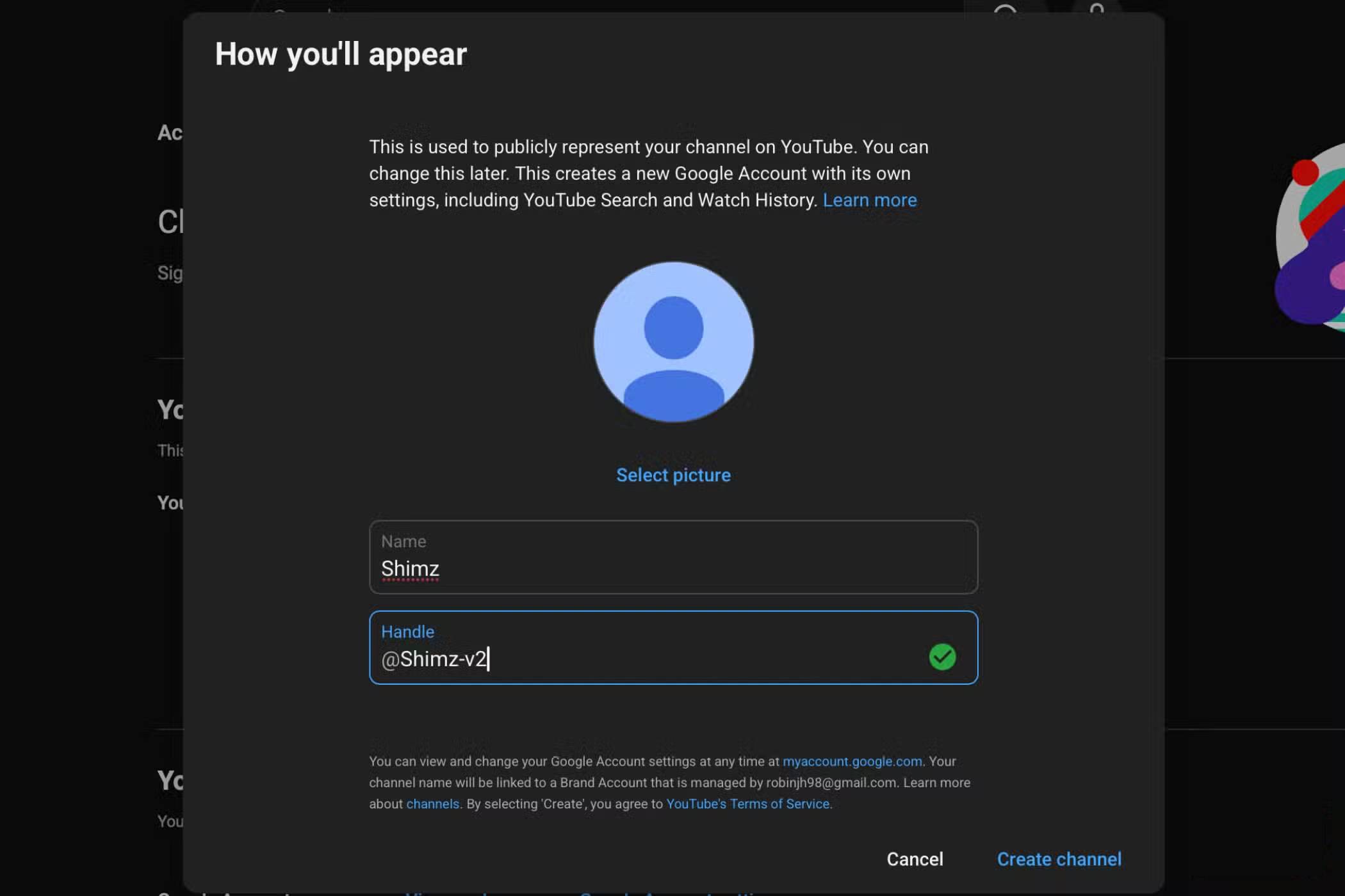 - Điền thông tin chi tiết kênh của bạn: Thêm ảnh đại diện (tùy chọn), chọn tên và chọn tên người dùng.