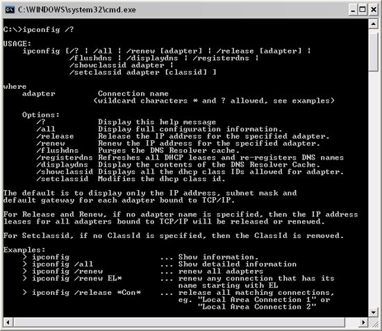 Bản thân câu lệnh này chỉ hiển thị thông tin chứ không làm được gì. Muốn lấy một địa chỉ IP khác, hãy gõ thêm tham số /release và /renew sau chữ ipconfig và một dấu cách. ipconfig /release sẽ điều khiển máy chủ DHCP xóa địa chỉ IP hiện có của tất cả các adapter, dù là mạng Ethernet hay không dây. Sau đó, lệnh ipconfig /renew nếu thành công thì một địa chỉ IP mới, một subnet mask mới và một gateway mặc định mới sẽ xuất hiện.