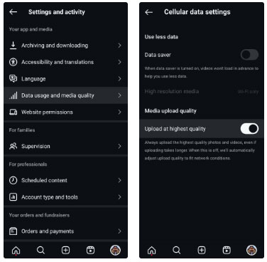 Để duy trì chất lượng ảnh và video của mình, hãy bật tùy chọn Upload at highest quality bằng cách vào Settings and activity > Data usage and media quality trong ứng dụng Instagram. Điều này đảm bảo rằng chất lượng upload không bị giảm để phù hợp với điều kiện mạng.
