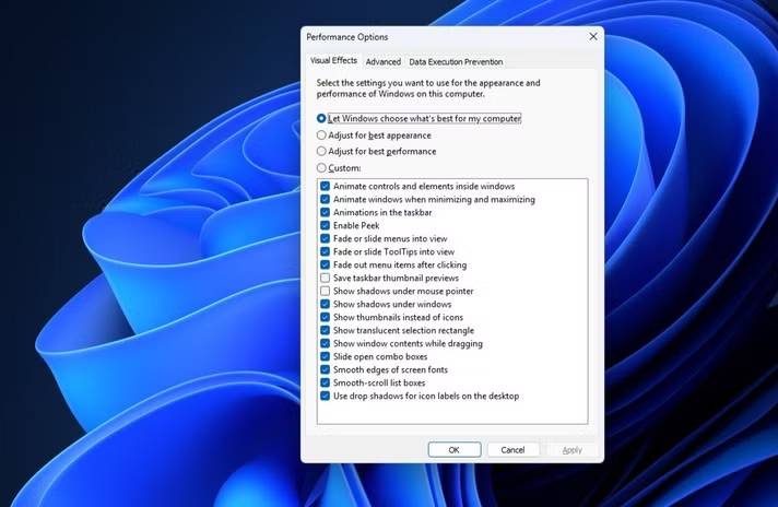 Điều này sẽ tắt các hiệu ứng bổ sung nhưng có thể làm giảm tính thẩm mỹ của màn hình. Để cân bằng giữa giao diện và hiệu suất, hãy chọn Custom và bật hoặc tắt thủ công các hiệu ứng cụ thể.