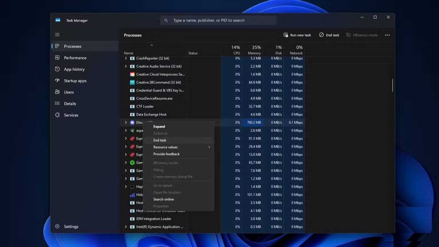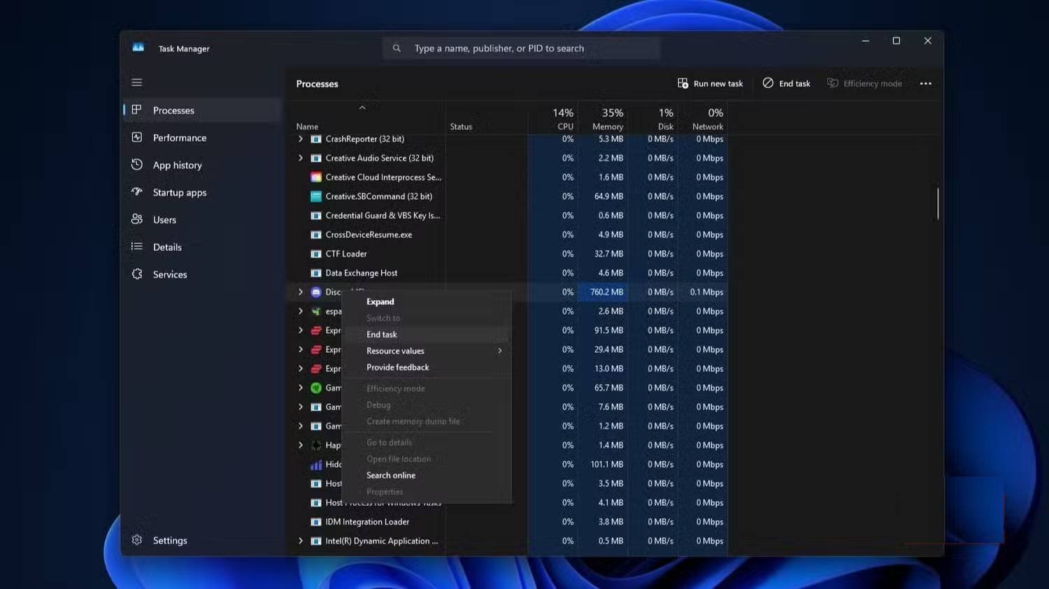 - Xác định các tiến trình sử dụng nhiều tài nguyên trong cột Background processes, nhấp chuột phải vào chúng và chọn End task.