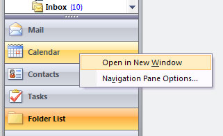 Bạn có cảm thấy nhàm chán khi phải kích vào các nút điều hướng mỗi khi muốn chuyển giữa Inbox và Calendar? Kích chuột phải vào bất cứ một nút điều hướng nào và chọn Open in a New Window, khi đó bạn sẽ giữ được Calendar hoặc Contacts mở trong các cửa sổ riêng. Chúng sẽ vẫn mở khi bạn xử lý các thông báo; khi di chuyển giữa các cửa sổ, bạn chỉ cần sử dụng Alt-Tab để điều hướng giữa chúng.