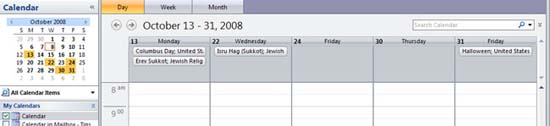 Bạn có thể hiển thị nhiều ngày tháng, liên tục hay không liên tục trong một lịch biểu bằng cách vào phần hiển thị lịch biểu hàng tháng trong phần trên bên trái của cửa sổ lịch biểu và nhấn Ctrl cộng với việc kích đồng thời ngày mà bạn muốn xem. Mỗi ngày mà bạn Ctrl-click sẽ xuất hiện dưới dạng một cột trong phần hiển thị Calendar chính. Bạn cũng có thể hiển thị một dải các này liên tục bằng cách kéo chuột trên một loạt các ngày trong tháng.