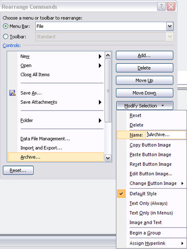 Bạn có muốn các lệnh vẫn sử dụng thường xuất hiện ở phần trên các menu của Outlook không? Rất đơn giản, chỉ cần chọn Tools | Customize, sau đó là tab Commands và kích Rearrange Commands... Trong hộp thoại đang mở, bạn có thể chuyển các mục menu lên hoặc xuống trong danh sách, xóa các mục bạn không cần thiết sử dụng và add thêm các mục mà bạn muốn. Cũng có thể tiết kiệm thời gian bằng cách chỉ định các phím nóng "accelerator key" để khởi chạy một mục menu nào đó khi bạn đánh một ký tự trong lúc menu đang mở. Để thay đổi hoặc tạo một phím nóng cho một mục menu nào đó, bạn hãy kích Modify Selection trong hộp thoại Rearrange Commands, chèn ký hiệu “&” ngay trước ký tự trong mục menu mà bạn đã chọn làm phím nóng.