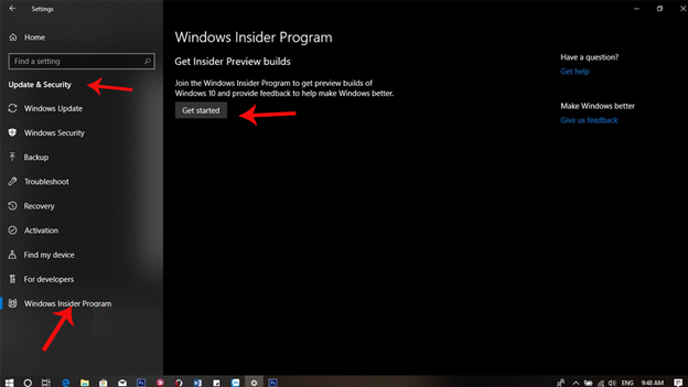 Bước 2: Kích vào mục Update & Security -> chọn tab Windows Insider Program -> kích vào Get started.