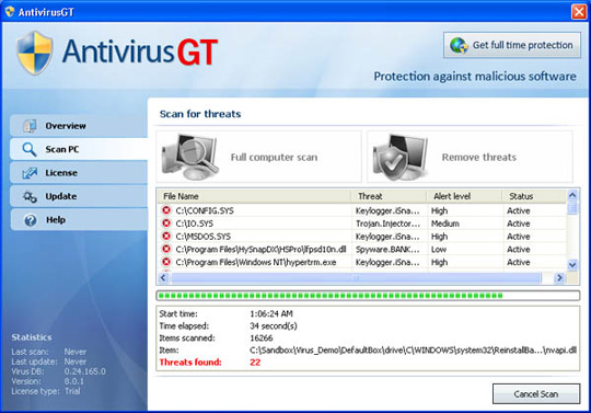 Nếu so sánh với các mẫu ứng dụng trên thì AntivirusGT có thể coi là 1 bản sao hoàn chỉnh của Antivirus7. Khi quá trình rà soát bắt đầu, AntivirusGT sẽ tự tạo và phát hiện ra các thông báo sai lệch về tình trạng và số lượng virus, Trojan và worm.