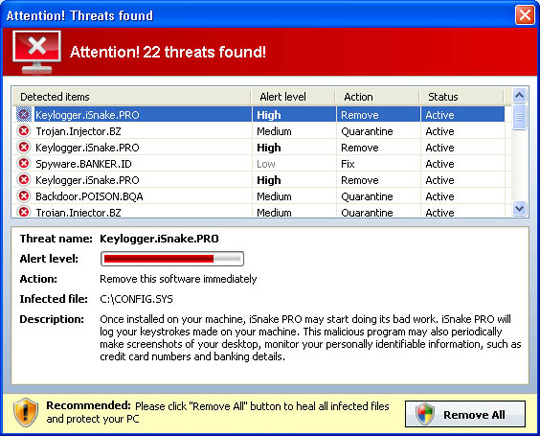 Là 1 chương trình an ninh giả mạo khá nguy hiểm và dễ dàng lây lan, khi cài đặt thành công vào máy tính nạn nhân, chương trình sẽ tiến hành quét toàn bộ khóa registry, liên tục hiển thị các thông tin sai lệch về virus, Trojan và worm được phát hiện trên hệ thống. Và những thông báo này chỉ biến mất khi người dùng mua bản quyền.