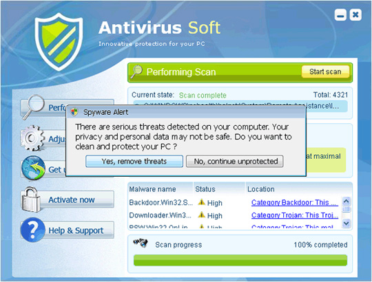 Antivirus Soft cũng được liệt vào hàng Rogue Security Software – phần mềm an ninh giả mạo, khi ngụy trang khéo léo thành 1 trong những ứng dụng an toàn đối với những người dùng ít kinh nghiệm, như chương trình quét virus hoặc rà soát registry. Nguồn gốc phát tán ứng dụng độc hại này là trang web www.newsoftspot.com (địa chỉ này đã không còn tồn tại). Cũng như tất cả các phần mềm giả mạo được liệt kê bên trên, Antivirus Soft khi hoạt động sẽ liên tục hiển thị các thông báo sai lệch về viruses, Trojans và worms. Nếu người dùng không mua key kích hoạt thì sẽ không tắt bỏ được các thông báo phiền phức đó.